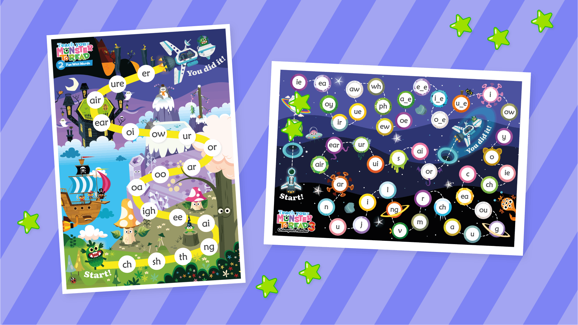 If you are a big fan of rewarding stickers for learning, and your child is too, why not use these Teach Your Monster to Read Progress Charts. One for each stage of Teach Your Monster to Read, mark progress with a pen or sticker every time a new letter sound is learned!