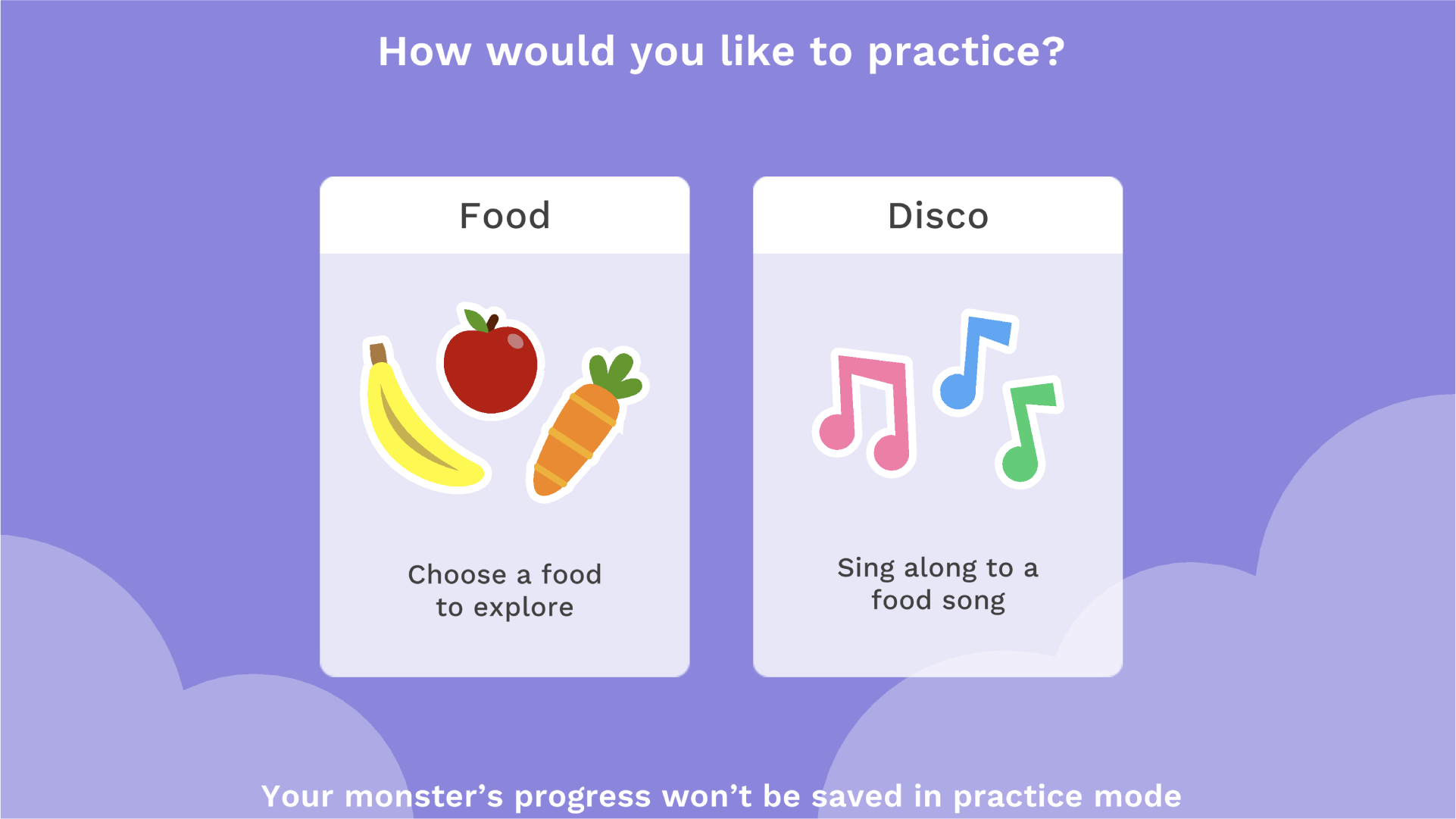 Adventurous Eating’s Practice Mode allows you to select particular fruit or vegetables, and interact with them using the monster’s senses. Designed to allow the adult to select a specific food, Practice Mode allows the child to interact with that food through the game, making them a little bit braver with it. It works well if you have a picky eater who doesn’t like certain foods — tomatoes, for example.